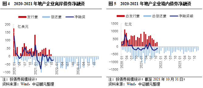 隨著更多的發行主體在境內外同時融資,對于市場參與者來說,兩個市場在制度上的割裂將逐步變小,風險傳導性加強。在發行方面看到,2021年中資企業美元債發行受境內風險事件影響,出現明顯下行,尤其是地產行業。地產企業面對境內外融資的大規模到期,流動性風險攀升,離岸債券發行規模明顯收縮,凈融資轉負。受此影響,2021年8月來境內債券發行也明顯減少,內外融資均受阻使得房企流動性風險持續加大。