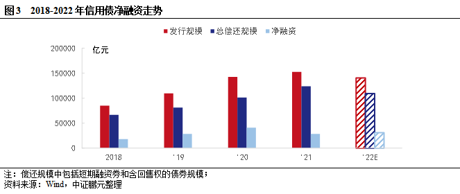 當前,融資分化依然是市場趨勢,結合主體級別和凈融資看,2021年信用債凈融資受到期規模較大影響,較上年出現明顯回落。其中AAA級降幅最大,主要是待償還規模明顯增長,且本年發行環境較上年有所收緊;其次,AA-及以下的降幅僅次于AAA級,發行規模的下降,一定程度上顯示出融資難度的上升。預計2022年信用債待償還規模較2021年有所回落,但償還規模仍大于2020年,且回售壓力有所提升,需要關注回售壓力大的企業。