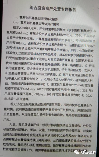“截止到2020年4月末,民生財富尊系列基金存量規模265億元;尊基金投資項目資產余額223億元。其中,已延期項目資產余額196億元,占尊基金投資項目資產余額88%;預計延期項目資產余額18億元,占尊基金投資項目資產余額8%。巨額的延期項目資產及預計延期項目資產已嚴重影響尊基金正常運行,同時,也直接導致尊基金無法按照監管要求降低規模,尊基金規模下降緩慢的情況已受到監管機構的重點關注并已對我司提出嚴重警告,監管機構要求我司須按照報告盡快實現尊基金降低規模并清零。”