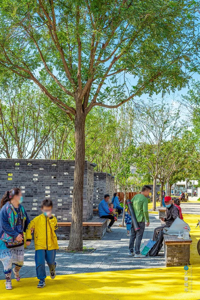灰磚和暖黃鋪裝在色彩上碰撞融合,剛硬的底色上傳達出了溫暖和樂觀的感覺,也與公園內的法桐樹、銀杏樹遙相呼應,深秋葉黃,必是一番好景致。穿孔灰色墻磚又與穿孔耐候鋼、不銹鋼雕塑交替組合,則在構件上實現了傳統與現代交融的層次感。