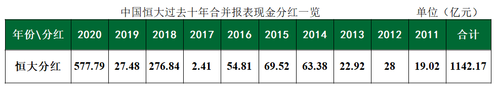 過去十年(2011-2020),恒大集團年年有分紅,合并報表范圍內分紅的現金總支出超過1142億,每到分紅期,市場都會刮起恒大豪氣分紅的旋風。