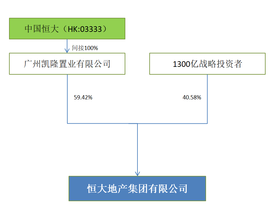 主要的區別在于,恒大集團1300億的戰投資金并不是投在上市公司本級,而是投在上市公司下屬子公司恒大地產集團有限公司(以下稱“恒大地產”),戰投占恒大地產40.58%的權益。