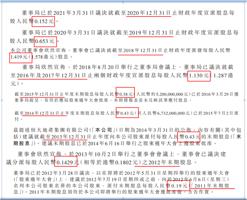 假使從上市公司股東的角度統計,過去十年,作為上市公司的中國恒大公告的分紅總額也超過672.83億。