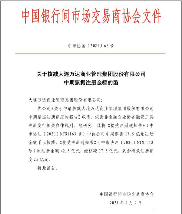 一個星期前,銀行間交易商協會函告萬達商業,其申請核減中期票據17.5億元注冊額度已被批準。