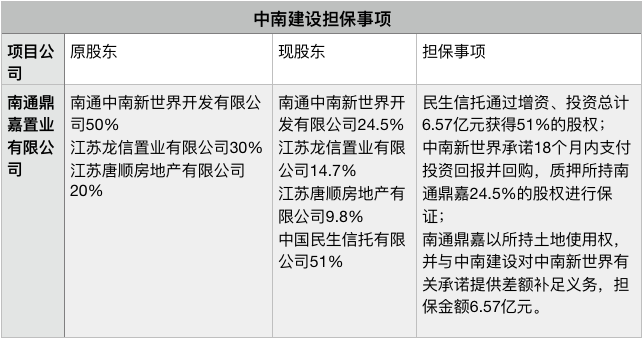 南通鼎嘉質押其土地,并與中南建設對南通新世界的承諾提供差額補足義務,擔保額度與民生信托投資額度相等。