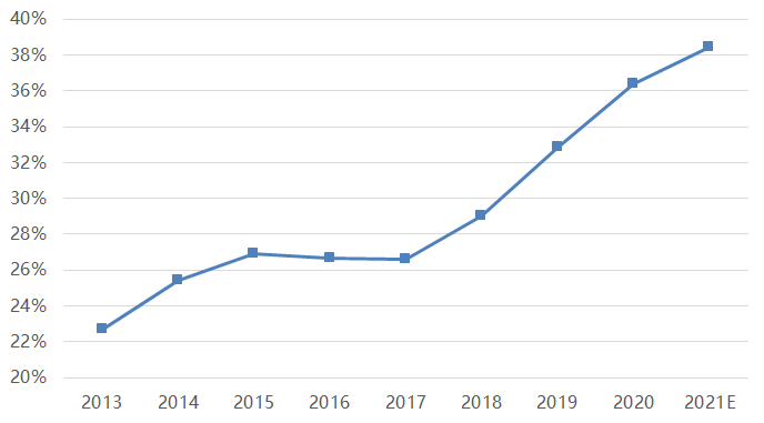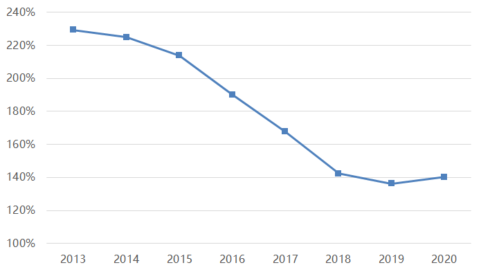 (居民存款+零售理財總值)/居民部門金融負債總值(2013年-2020年)