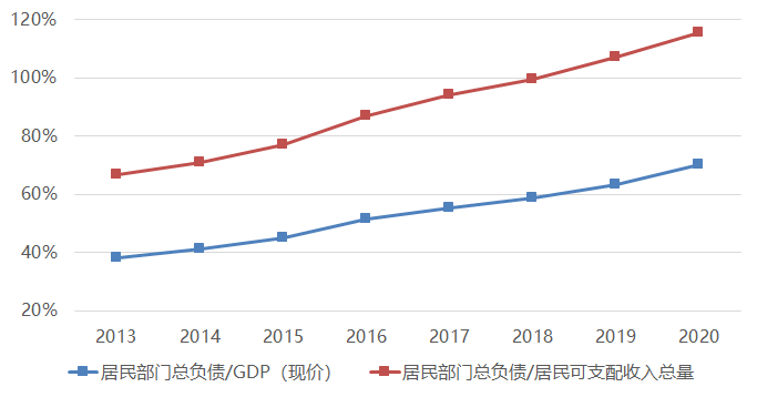 居民部門總負債與GDP/居民可支配收入總量的比值(2013年-2020年)