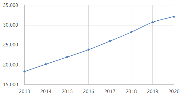 居民人均可支配收入(元,2013年-2020年)
