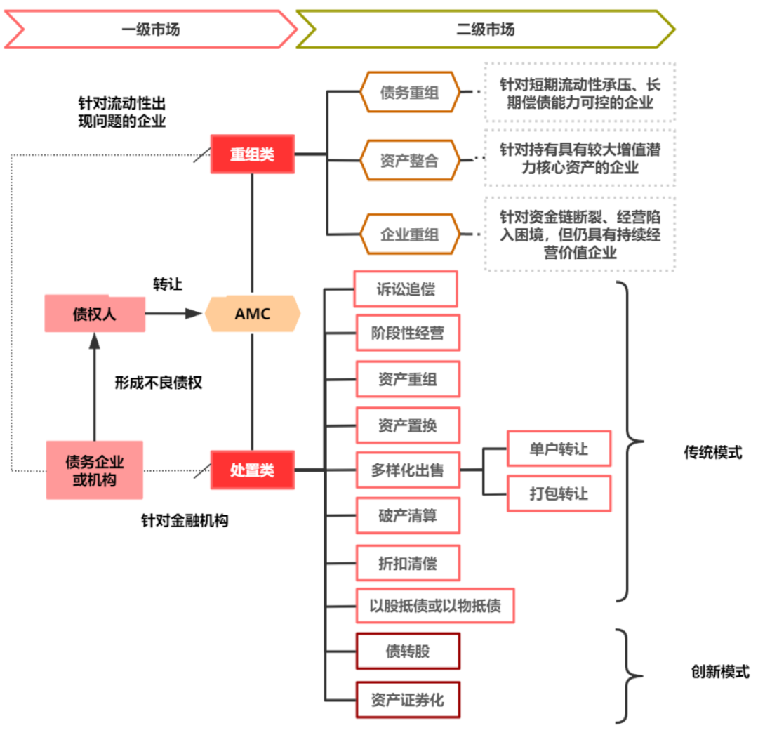 AMC的不良資產(chǎn)處置模式主要分為收購處置類業(yè)務和收購重組類業(yè)務。其中,涉房類不良資產(chǎn)以信托貸款、委托貸款和各類應收賬款的債權(quán)資產(chǎn)為主,歸屬于重組類業(yè)務。