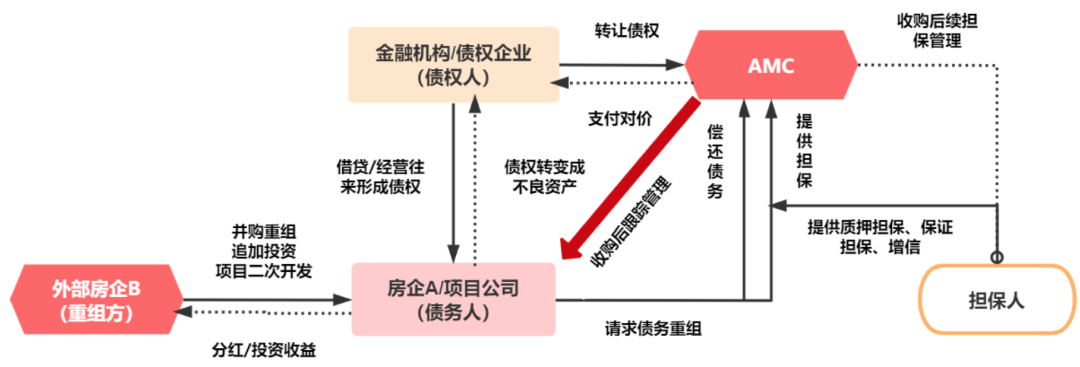 而AMC則可以借助房企進行項目開發(fā),化解自行開發(fā)的局限性,或者在為房企進行融資服務的過程中,獲取利息收益。