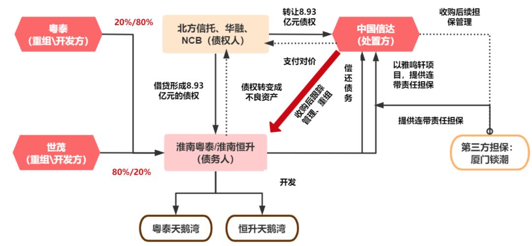 以信達收購粵泰天鵝灣和恒升天鵝灣合計8.93億債權(quán)為例。2019年6月,世茂耗資63.97億元收購粵泰資產(chǎn)包,世茂牽頭引入信達負責債務重組,而項目股權(quán)、開發(fā)和操盤上不發(fā)生變更,依舊由世茂和粵泰共同持股、聯(lián)合開發(fā)。