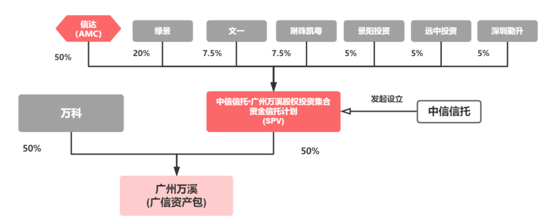 2020年6月萬科發(fā)布《關于廣信資產(chǎn)包引入戰(zhàn)略合作的公告》,采用“股權(quán)+債權(quán)”的交易方式,將廣信資產(chǎn)包以8.33折(390.4/470.4)出讓50%的權(quán)益予以信達在內(nèi)的七位戰(zhàn)投,整體回籠資金390.4億元。交易完成后,萬科和綠景負責廣信資產(chǎn)包的整理與開發(fā),其他五位戰(zhàn)投充當財務投資者。而信達收購廣信資產(chǎn)包25%的權(quán)益,將進行債務重組、追加投資來盤活不良資產(chǎn),同時作為戰(zhàn)投提供資金的同時,能按照股權(quán)比例獲得相應的經(jīng)營收益。