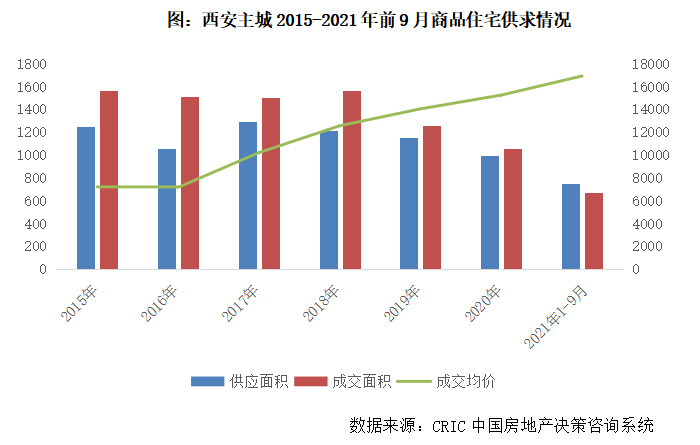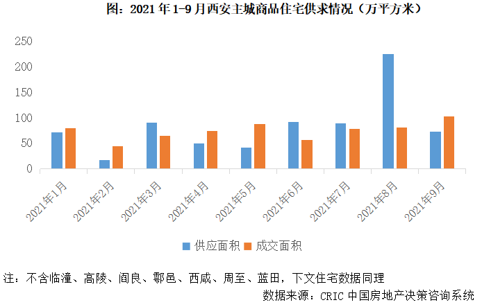 2021年以來,在“330”、“830”兩次調控加碼之下,西安樓市總體保持平穩運行,受制于供應縮量,成交相較往年有所回調。前9月,西安主城區商品住宅供應面積752萬平方米,同比微升5%,較2019年同期下降9%,成交面積674萬平方米,同比下降9%,較2019年同期下降29%。