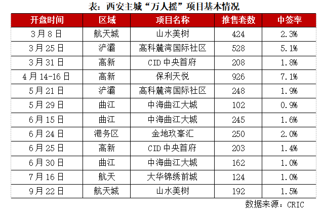 截至9月末,西安樓市出現12次“萬人搖”,中海曲江大城獨攬三次,高科麓灣國際社區、CID中央首府、山水美樹均兩次上榜。人氣最高的當屬航天城山水美樹項目,共計獲得2.3萬組意向登記,超1.8萬人核驗通過參與搖號,瓜分區區424套房源。5月29日開盤的中海曲江大城中簽難度最高,102套房源吸引近1.2萬人搖號,中簽率不足1%。