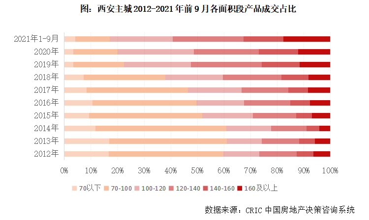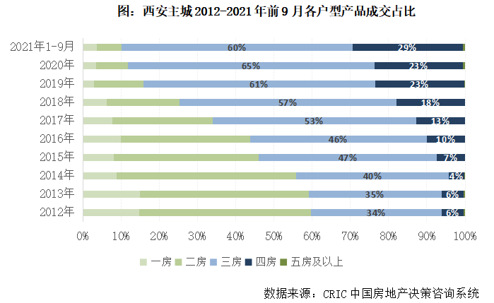 不難發現,西安三房、四房產品成交占比逐年提升,并逐漸占據絕對主導地位。2015年,三房成交占比首度超過二房,2017年,三房成交占比突破50%,此后穩步提升至六成以上。2016年,四房成交占比首次超過10%,到2021年前9月,比重已接近三成。反觀二房產品日漸邊緣化,成交占比由2015年的38%降至2021年的6%。