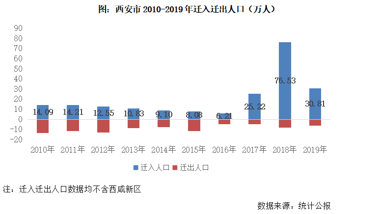 從遷出人口數據來看,2010-2015年,西安平均每年遷出10萬人以上,而2016年-2019年,年均僅6萬人遷出,遷出人口規模顯著下降直觀反映西安城市人口吸附力增強。