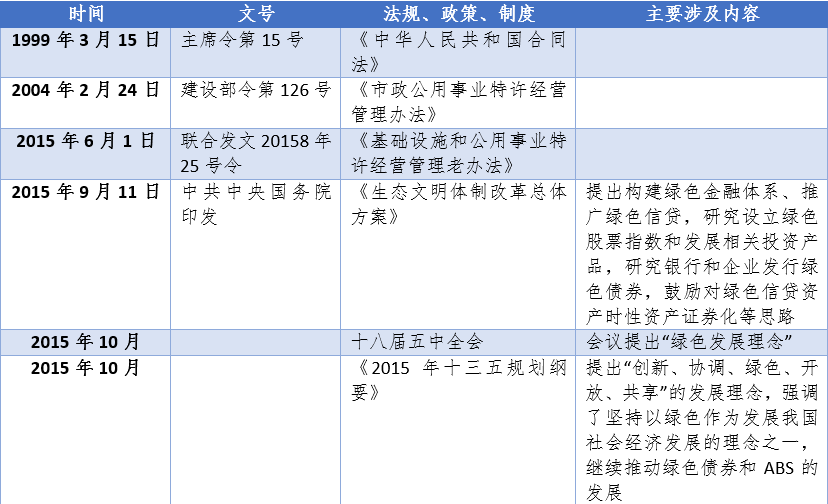 能源基礎設施是國家關注的重點項目,對如何可持續的發展能源基礎設施建議以匹配快速增長的能源消費和龐大的工業投資尤為重要。“一帶一路”戰略的提出以及城鎮加速化帶來的公共基礎設施共需壓力,促使經濟發展對資金需求不斷增加,如何拓寬融資渠道、創新融資模式成為研究的新課題。為了更好的促進能源基礎設施建設,綠色金融應運而生,我國政府在各個行業廣泛推廣PPP模式及合同能源管理等綠色金融模式,并出臺了一些列輔助這些金融模式工作開展的文件與通知。