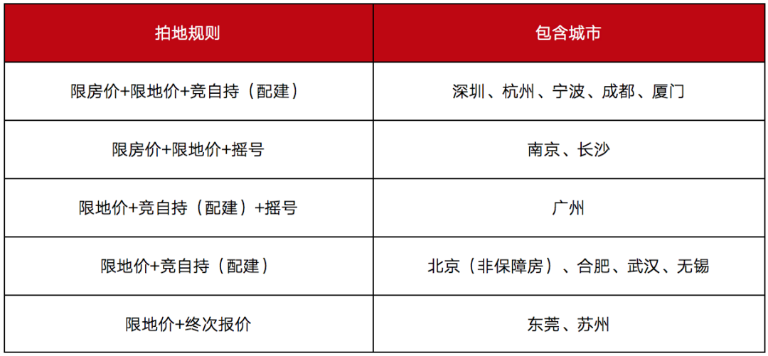 修改競拍方式也是熱點城市常用的調控方式之一。2020年以來,熱點城市對重點地塊基本采取“限地價、競自持或配建”的競拍方式,由于競自持無上限,導致房企實際拿地成本攀升,樓面地價上漲壓力仍然較大。為穩地價不少城市調整土地競拍規則,在“競自持或配建”的基礎上增加“當自持或配建面積達上限后搖號”等。