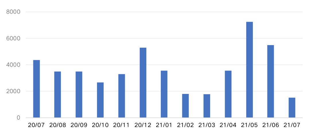 圖:2017-2021年7月房企境內(nèi)發(fā)債規(guī)模(億元)