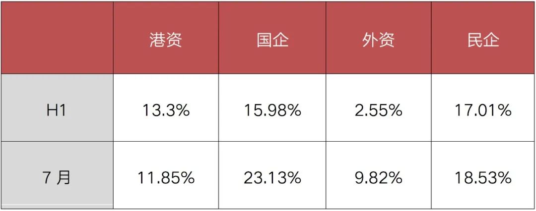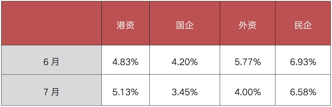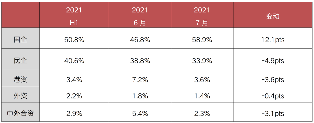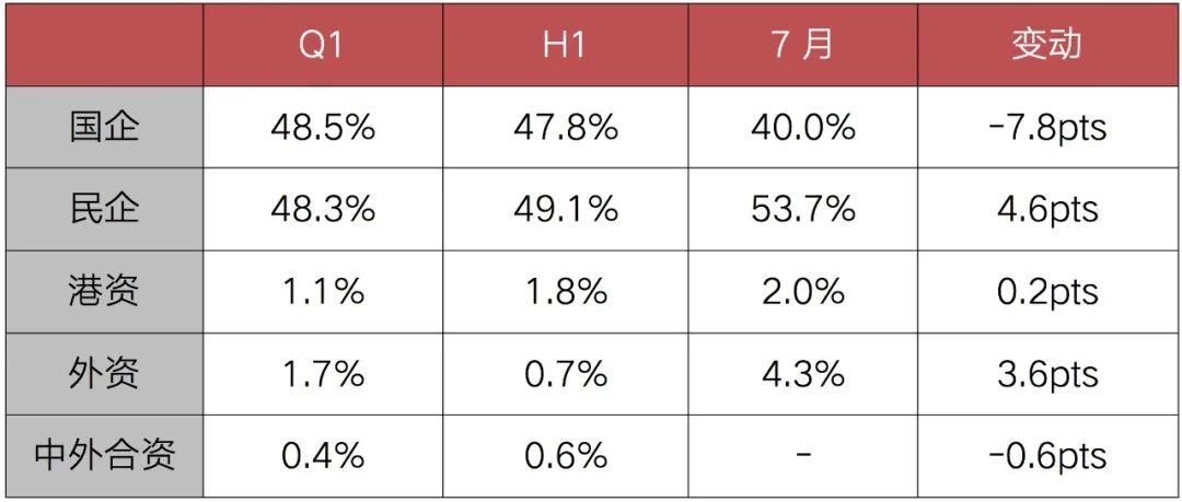 從企業(yè)性質(zhì)方面看,民企拿地投資勢頭連續(xù)回升,投資占比由一季度的48.3%上半年提升至49.1%,7月更是回升至53.7%。國企方面,7月拿地投資占比較上半年有小幅下降,40%為今年最低,在8、9月集中供地后有望有所恢復(fù)。