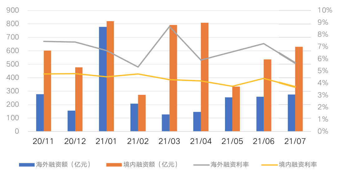 圖:近9個月房企境內(nèi)及海外債總額(億元)&融資利率