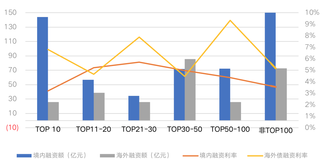 從企業(yè)規(guī)模來看,國內(nèi)各梯隊房企境內(nèi)發(fā)債成本相差不大,均在5%上下,其中,TOP10和非TOP100房企發(fā)債成本最低,TOP10龍頭房企僅為3.21%,而非TOP100房企中可以成功發(fā)行債券的9成為國企背景,寬貨幣緊信用的態(tài)勢凸顯,資金仍有濃厚的避險情緒。海外債方面,以TOP50-100房企海外發(fā)債融資成本最高,對于這些國內(nèi)發(fā)債艱難的房企來說,出海高息發(fā)債也是一個不得已的選擇。
