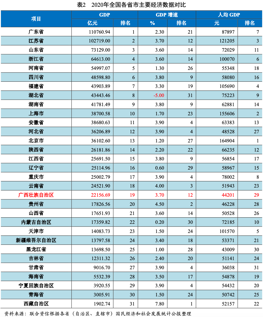從經(jīng)濟(jì)運(yùn)行方面看,近年來(lái)廣西經(jīng)濟(jì)總量不斷增長(zhǎng),但增速有所放緩。2020年,廣西地區(qū)生產(chǎn)總值(GDP)位居全國(guó)第19名,處于全國(guó)中下游水平。2018-2020年,廣西GDP增速持續(xù)放緩,2020年GDP增速高于全國(guó)GDP增速1.40個(gè)百分點(diǎn)。2018-2020年,廣西人均GDP逐年提高,2020年廣西人均GDP為全國(guó)平均水平的0.61倍,位居全國(guó)第29名。廣西三次產(chǎn)業(yè)結(jié)構(gòu)由2018年的15.4:34.1:50.5調(diào)整為2020年的16.0:32.1:51.9,第三產(chǎn)業(yè)比重大幅提高。固定資產(chǎn)投資方面,2020年,廣西全年固定資產(chǎn)投資同比增長(zhǎng)4.2%,高于全國(guó)平均增速,增速較2019年的9.5%明顯放緩。