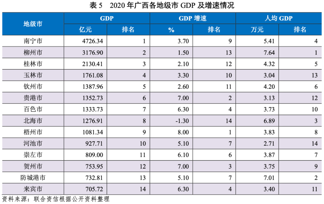從GDP增速來(lái)看,2020年,梧州市、貴港市、賀州市、百色市、來(lái)賓市和崇左市6個(gè)地級(jí)市GDP增速達(dá)到6.00%及以上;玉林市、欽州市、桂林市、柳州市和北海市的GDP增速低于全省平均水平,不足3.70%,其中北海市的GDP增速為負(fù)。從人均GDP看,柳州市、防城港市和北海市3個(gè)地級(jí)市2020年人均GDP均超過6萬(wàn)元,最高為柳州市(7.64萬(wàn)元),河池市2020年人均GDP不足3萬(wàn)元,其他10個(gè)地級(jí)市人均GDP水平在3~6萬(wàn)之間。