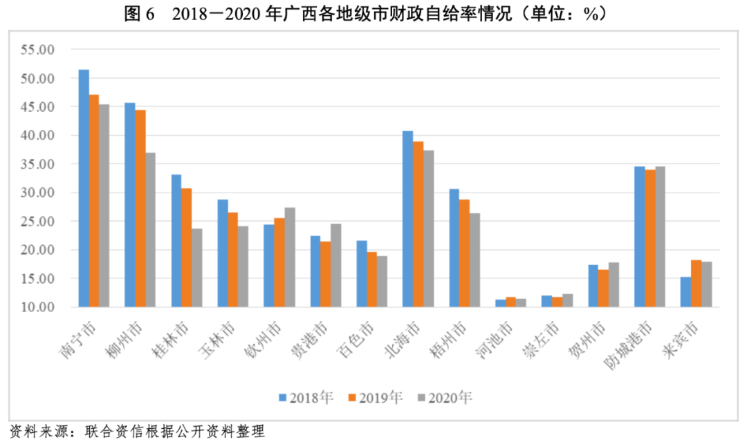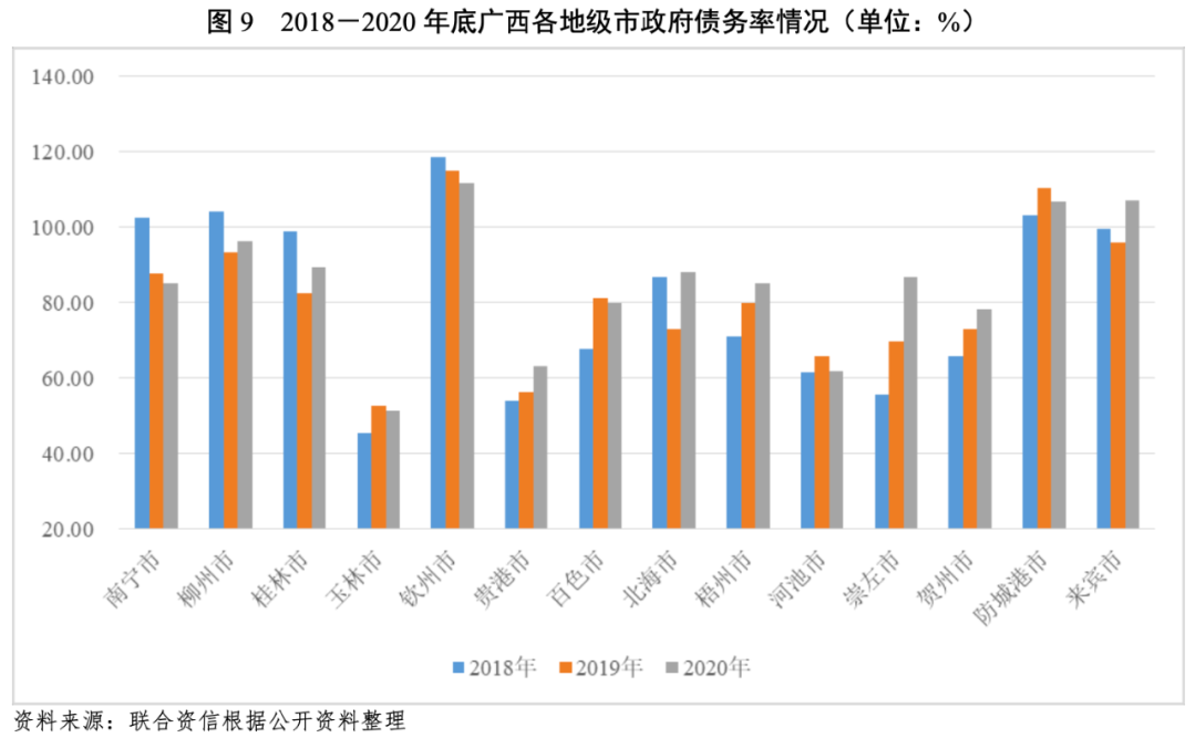 廣西各地級(jí)市中南寧市的一般預(yù)算收入和基金收入規(guī)模遠(yuǎn)高于其他地級(jí)市,賀州市、來(lái)賓市和崇左市一般預(yù)算收入規(guī)模較小;廣西大部分地級(jí)市一般公共預(yù)算收入的穩(wěn)定性一般,財(cái)政自給能力偏弱。廣西各地級(jí)市政府債務(wù)余額呈上升趨勢(shì),崇左市債務(wù)余額增速最快。2020年,廣西各地級(jí)市政府負(fù)債率均有所提升,但整體債務(wù)負(fù)擔(dān)相對(duì)較輕;欽州市、來(lái)賓市和防城港市政府債務(wù)率較高,償債壓力較大。