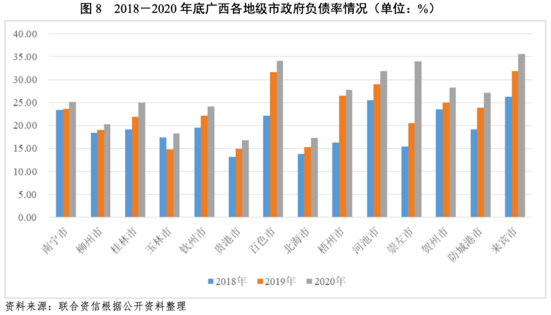 債務(wù)負(fù)擔(dān)方面,截至2020年底,各地級(jí)市政府負(fù)債率均有所提升,但整體債務(wù)負(fù)擔(dān)相對(duì)較輕。其中,崇左市政府負(fù)債率較上年底提升13.49個(gè)百分點(diǎn),來(lái)賓市、玉林市、防城港市、賀州市和桂林市政府負(fù)債率均較上年底提升3~4個(gè)百分點(diǎn),其他8個(gè)地級(jí)市政府負(fù)債率均較上年底提升1~3個(gè)百分點(diǎn)。截至2020年底,來(lái)賓市、百色市、崇左市和河池市政府負(fù)債率高于30%。