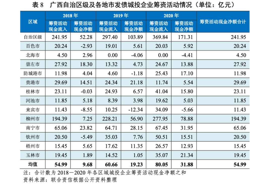 從廣西自治區(qū)級(jí)及各地市發(fā)債城投企業(yè)籌資活動(dòng)凈現(xiàn)金流狀況看,2018-2020年,自治區(qū)級(jí)、南寧市及柳州市城投企業(yè)融資能力明顯強(qiáng)于其他區(qū)域。2020年,北海市和來(lái)賓市償還了較多債務(wù),籌資活動(dòng)現(xiàn)金流為凈流出,其他地級(jí)市發(fā)債城投企業(yè)籌資活動(dòng)現(xiàn)金流均表現(xiàn)為凈流入。