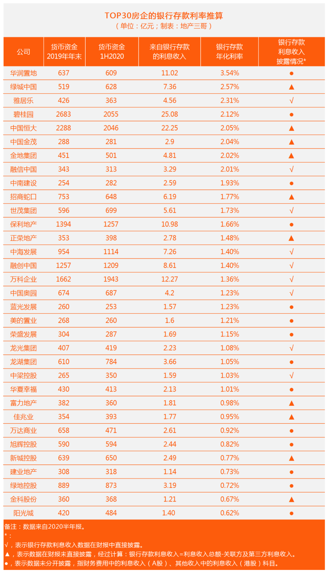 融創(chuàng)、中海、萬科、奧園都直接披露了銀行存款利息收入,年化的存款利率區(qū)間在1.2%-1.4%。