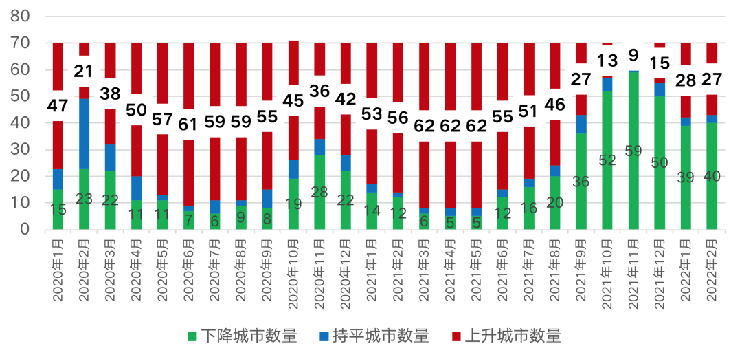 值得注意的是,2月只有27個城市房價環比上漲,較去年同期減少了五成之多,房價下跌的城市多達40個,而去年同期僅12個城市房價下跌。