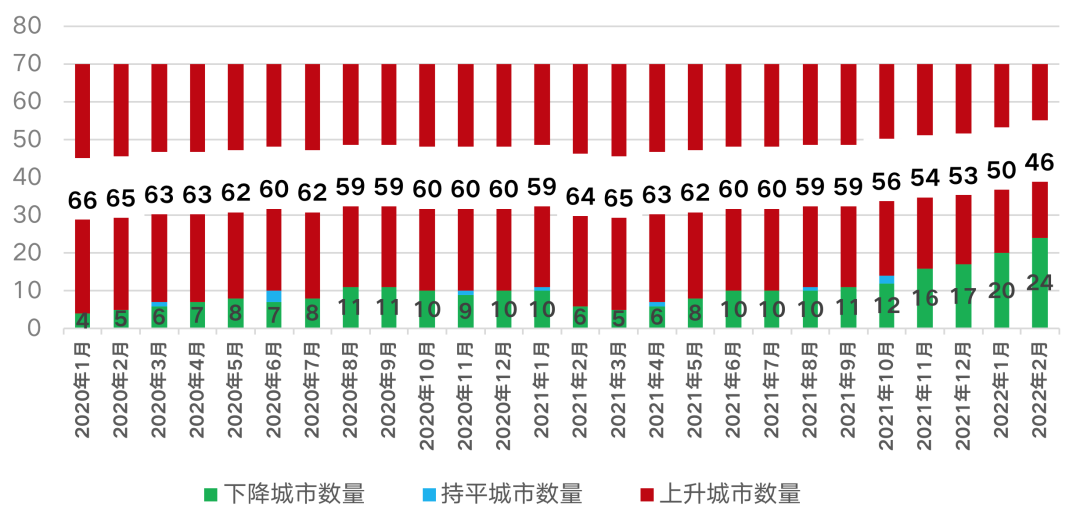 從房價上漲城市數量來看,自2020年1月以來,房價同比上漲城市數量不斷減少,2月新建商品住宅同比上漲城市有46個,較2020年1月減少29%。
