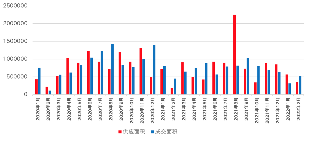 圖:2020年1月至2022年2月西安商品住宅供求情況(單位:平方米)
