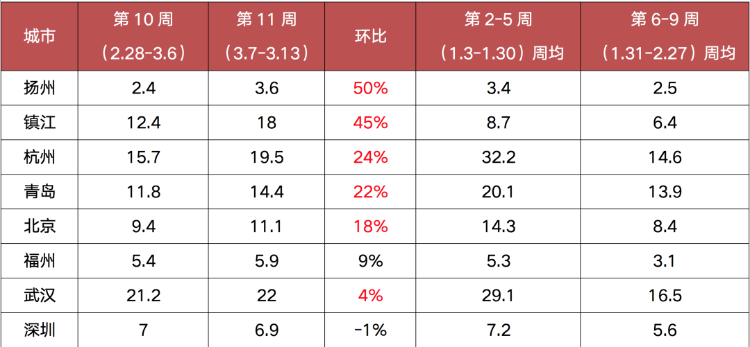 從新房市場周成交數據也可以看出,整體成交走勢延續小幅下行趨勢,但東南沿海核心二三線城市和基本面良好的內陸二線城市已出現回暖苗頭。以武漢、杭州、青島、北京、揚州等為典型代表,杭州、青島第11周環比漲幅均超20%,一線城市中北京第11周環比漲幅也達18%。回落城市以基本面較差的三四線城市為主,長沙、南京則迎來階段性回調期。