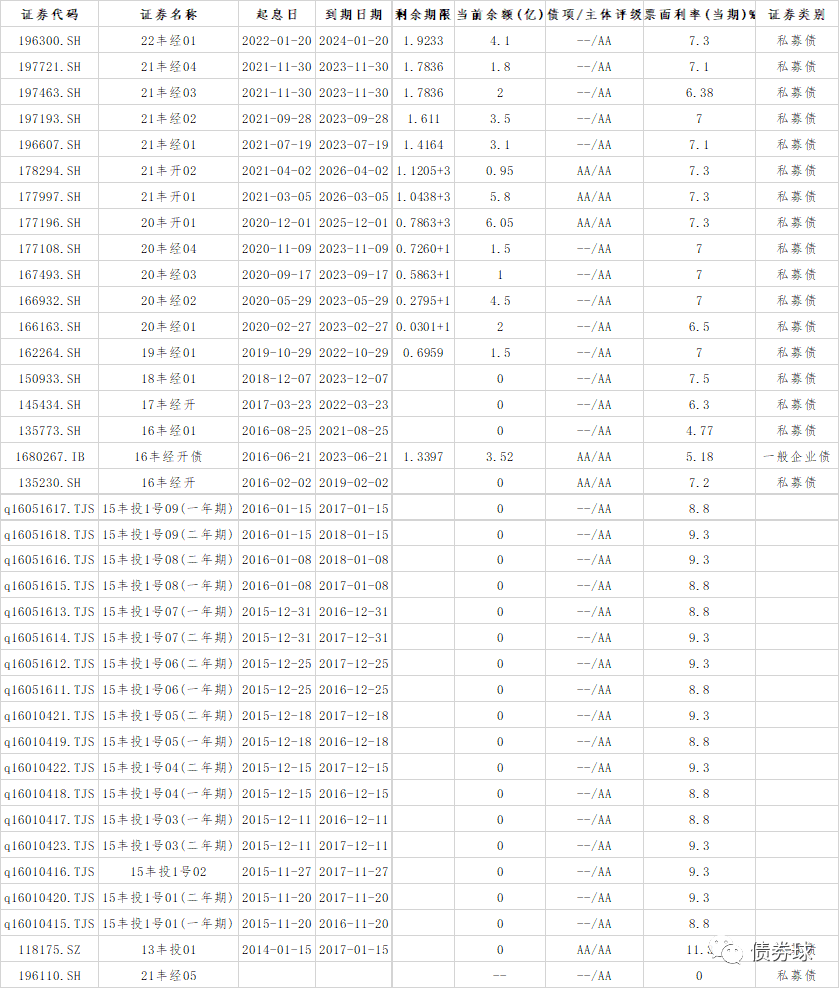 豐縣經(jīng)開累計(jì)發(fā)行37只債券(產(chǎn)品),其中交易所非公開公司債19只、企業(yè)債1只、天交所產(chǎn)品17只。這里的天交所產(chǎn)品名稱為私募債券,對于這樣的稱呼,筆者以為值得商榷,因此就用產(chǎn)品進(jìn)行了替代。目前,風(fēng)險(xiǎn)經(jīng)開存續(xù)的債券有14只,1只企業(yè)債和13只非公開公司債。