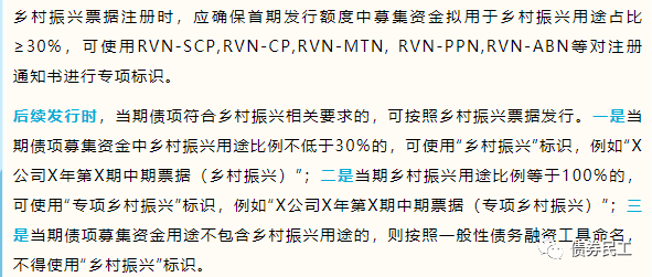 鄉村振興票據對于用于鄉村振興領域的募集資金比例最低要求是30%。不低于30%的,可以在票據名稱中冠“(鄉村振興)”;100%用于鄉村振興的,可以在票據名稱中冠“(專項鄉村振興)”。鄉村振興票據對于募集資金使用比例的限制,和疫情防控債的要求類似,也有可能會在未來提高。在疫情防控債剛開始發行的時候,要求募集資金不低于10%用于疫情防控領域;隨著發行數量的加大,疫情防控債在2020年下半年提高了準入門檻,要求募集資金不低于50%用于疫情防控領域。