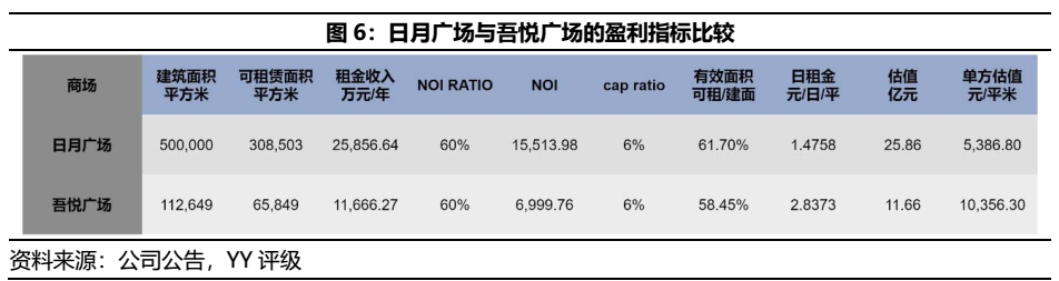根據對NOI RATIO和CAP RATIO的相關假設,我們可利用新城控股與海航基礎的19年年報得出吾悅廣場和日月廣場的單方估值與單方日租金,后者的粗放運營與建筑設計導致其單方創收的租金遠低于較郊區的吾悅廣場。