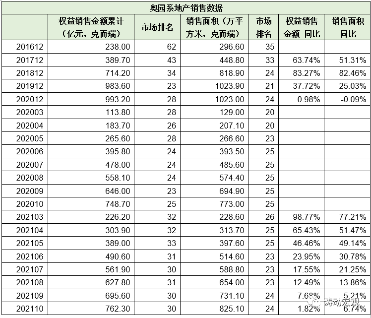 今年前10個(gè)月,奧園地產(chǎn)的權(quán)益銷售金額和銷售面積分別為762.30億元和825.10萬(wàn)平方米,同比分別增長(zhǎng)1.82%和6.74%,數(shù)據(jù)上看還可以。不過(guò)奧園地產(chǎn)在全國(guó)地產(chǎn)行業(yè)中的排名這幾年一直處于上升態(tài)勢(shì),從2016年的62名(按權(quán)益銷售金額)和35名(按銷售面積)提升至2019年的20名左右,但2020年以來(lái)奧園系的市場(chǎng)排名回落至30位左右。