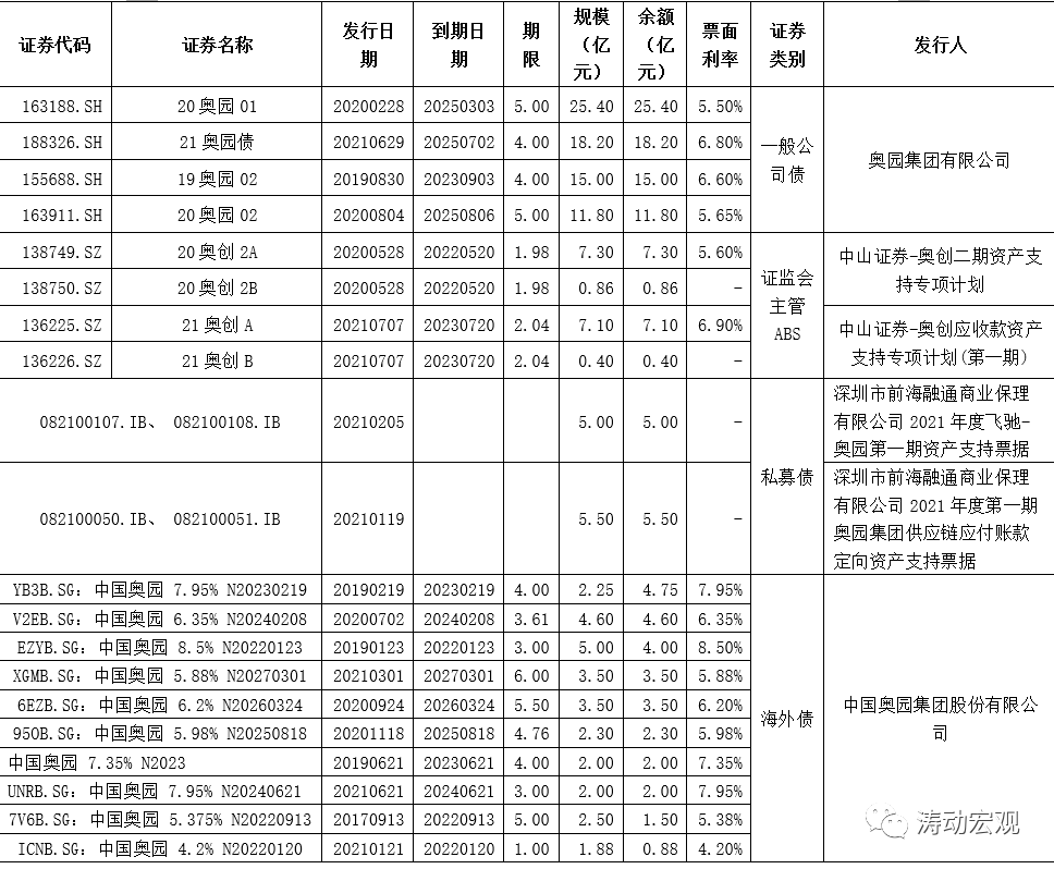 1、目前奧園系共有20只存量債券,分別為10只境內(nèi)債券(余額合計(jì)達(dá)到96.56億元人民幣)和10只境外債(余額合計(jì)達(dá)到29.03億美元),前者由奧園集團(tuán)有限公司為主體發(fā)行,后者則由中國(guó)奧園集團(tuán)為主體發(fā)行。