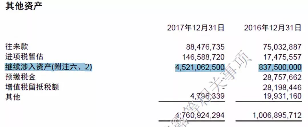 商誠小貸對繼續(xù)涉入資產(chǎn)和負(fù)債的表述如下:“截至2017年12月31日,本集團(tuán)因繼續(xù)涉入確認(rèn)的資產(chǎn)的賬面價值為人民幣4,521,062,500元(2016年12月31日:人民幣837,500,000元),與之相關(guān)的負(fù)債為人民幣4,521,062,500 元(2016 年12 月31 日:人民幣837,500,000元),分別計入繼續(xù)涉入資產(chǎn)和繼續(xù)涉入負(fù)債,該等負(fù)債金額表示本集團(tuán)因持有次級檔計劃,收益分配處于次級而導(dǎo)致可能不能收回的最大現(xiàn)金流。”