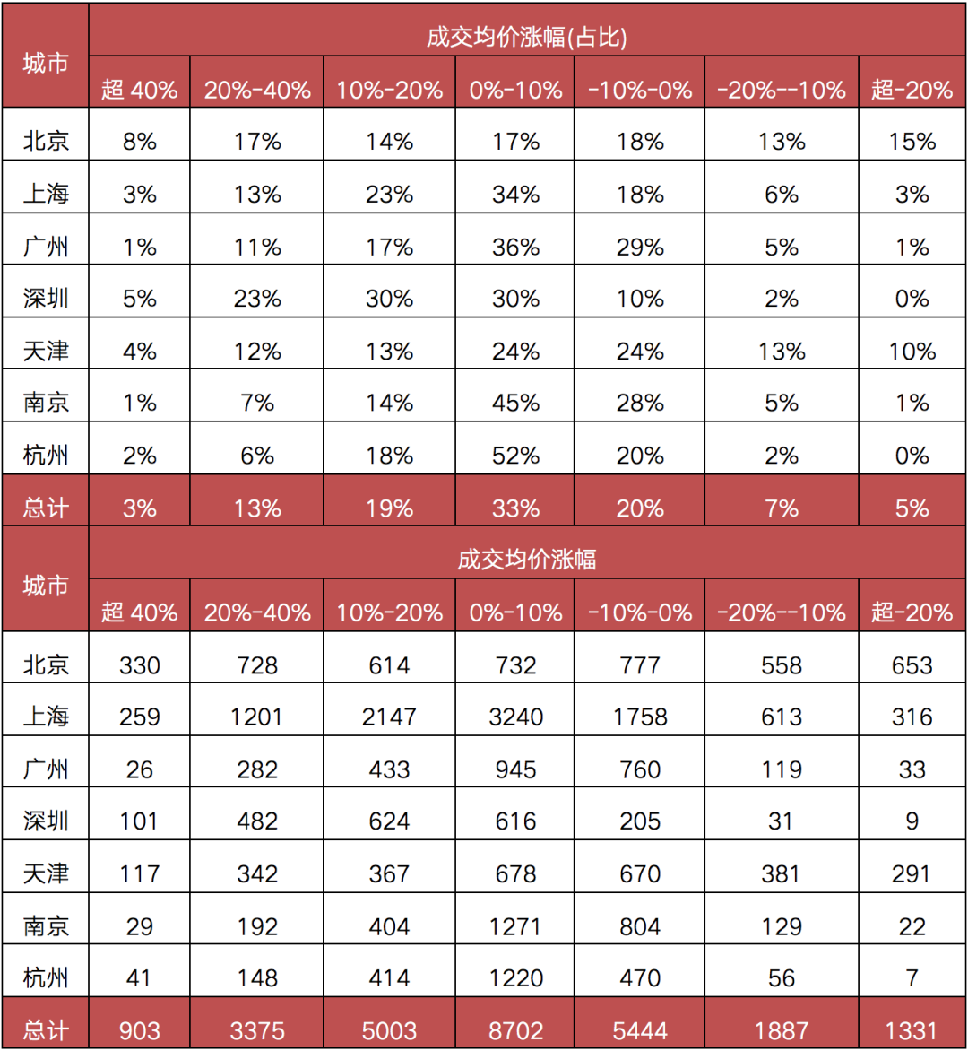而從整體7個樣本城市26645個小區來看,53%的在售小區房價漲跌幅在10%以內,其中僅3%的小區房價漲幅超40%,絕大多數占比33%的小區漲幅不足10%。在這其中,北京是少見的即有小區成交漲幅超40%,也有較多小區跌幅超20%的城市。