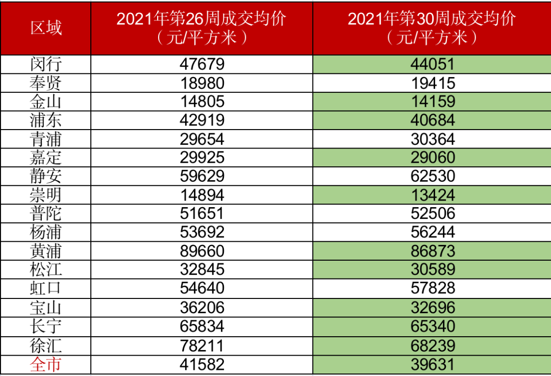 結果顯示,全市來看,2021年26周上海全市商品房成交價為41582元/平方米,隨著二手房“核定價”的發布,2021年30周上海全市商品房成交價降至39631元/平方米,一個月不到的時間就已跌去約2000元/平方米。