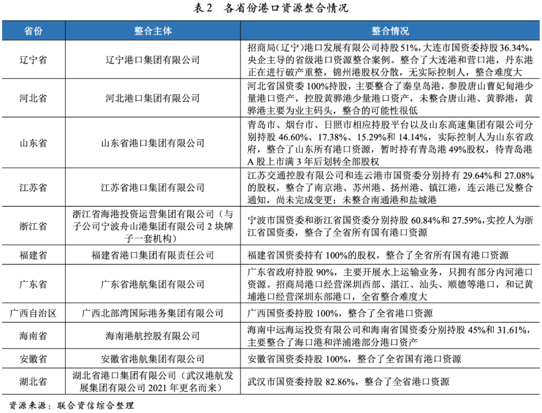 從2012年開(kāi)始,中國(guó)港口貨物吞吐量增速明顯放緩,行業(yè)從快速成長(zhǎng)期步入成熟期;部分港口企業(yè)經(jīng)營(yíng)開(kāi)始惡化,債務(wù)壓力凸顯,區(qū)域港口之間競(jìng)爭(zhēng)的矛盾愈加突出。為解決傳統(tǒng)“一港一企”模式帶來(lái)的地方保護(hù)主義、港口重復(fù)建設(shè)和經(jīng)營(yíng)效率低下等問(wèn)題,2015年浙江省國(guó)資委組建了浙江省海港投資運(yùn)營(yíng)集團(tuán),并相繼完成了省內(nèi)沿海五港和內(nèi)河港口的全面整合,并取得顯著成效;2017年8月,交通運(yùn)輸部發(fā)文要求全國(guó)學(xué)習(xí)浙江港口整合經(jīng)驗(yàn),從此開(kāi)啟了省級(jí)港口整合的大幕。目前,港口資源豐富的各省份均已成立了相應(yīng)的省級(jí)港口集團(tuán),其中廣東省由于港口運(yùn)營(yíng)主體背景復(fù)雜,未來(lái)整合難度大;河北省和江蘇省均整合了部分港口資源,未來(lái)還有進(jìn)一步整合的空間;其他各省份基本已完成全省港口資源的初步整合,“一省一港”的行業(yè)格局基本形成。但港口集團(tuán)內(nèi)部如何優(yōu)化資源分配、提高協(xié)同效應(yīng)仍需持續(xù)探索,港口整合符合行業(yè)發(fā)展和區(qū)域一體化發(fā)展的政策方向,在供給側(cè)改革和國(guó)企改革的大背景下,整合有望持續(xù)深化。