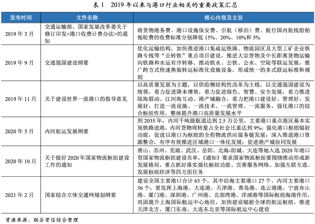 近年來(lái),港口規(guī)劃建設(shè)著重強(qiáng)化港口與其他交通方式的互聯(lián)互通能力以及作為交通樞紐的經(jīng)濟(jì)輻射功能,并逐步完善市場(chǎng)化、規(guī)范化的港口收費(fèi)體系。目前,“一省一港”的行業(yè)格局基本形成,但港口集團(tuán)內(nèi)部資源整合仍有望持續(xù)深化。