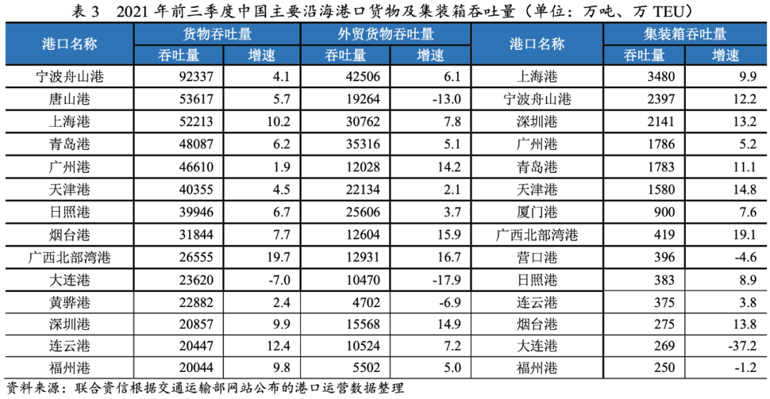 受新冠肺炎疫情沖擊影響,2020年中國(guó)港口吞吐量增速明顯下降;2021年前三季度貨物吞吐量增速基本已回歸至2019年水平,集裝箱吞吐量增速受益于出口形勢(shì)較好顯著高于2019年水平;不同港口吞吐量增速受腹地經(jīng)濟(jì)及貨種結(jié)構(gòu)影響存在分化,個(gè)別港口吞吐量降幅較大。