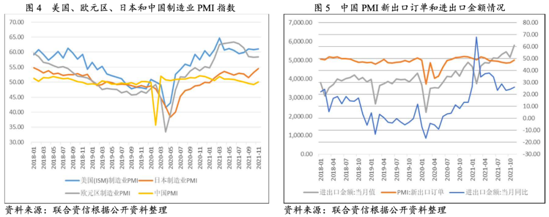 從全球經(jīng)濟(jì)發(fā)展角度看,2020年爆發(fā)的新冠肺炎疫情對(duì)全球經(jīng)濟(jì)造成劇烈沖擊,中國(guó)、美國(guó)、日本和歐元區(qū)制造業(yè)PMI指數(shù)分別于2020年2~5月創(chuàng)下了35.70%、41.50%、33.40%和38.40%的低點(diǎn)。隨著疫情防控的常態(tài)化,企業(yè)得以逐步復(fù)工復(fù)產(chǎn),美國(guó)和歐洲經(jīng)濟(jì)體普遍采取較大力度的財(cái)政、貨幣刺激方案,美國(guó)和歐元區(qū)制造業(yè)PMI從低點(diǎn)持續(xù)上升,并分別于2021年3月和6月創(chuàng)下64.70%和63.40%的高點(diǎn),之后開(kāi)始逐步回落。日本疫情控制相對(duì)較好,經(jīng)濟(jì)刺激手段也相對(duì)克制,制造業(yè)PMI指數(shù)走勢(shì)與美歐基本趨同但波動(dòng)幅度明顯較小,10月份以來(lái)受西方節(jié)前備貨需求影響明顯回升。中國(guó)疫情于2020年3月基本得到控制,之后制造業(yè)PMI指數(shù)一直在50.60%~52.10%之間小幅波動(dòng),直到2021年3月之后開(kāi)始回落,9月份開(kāi)始跌破50%的榮枯臨界點(diǎn),11月受西方節(jié)前備貨需求影響略有回升,國(guó)內(nèi)經(jīng)濟(jì)下行壓力加大。疫情對(duì)全球經(jīng)濟(jì)的影響已明顯弱化,且受制于全球通脹壓力不斷積累,各國(guó)開(kāi)始逐步退出寬松政策,預(yù)計(jì)未來(lái)全球經(jīng)濟(jì)增速將有所放緩。國(guó)際貨幣基金組織最新預(yù)測(cè)2021年全球經(jīng)濟(jì)將增長(zhǎng)5.8%,2022年將增長(zhǎng)4.9%,2022年增速較2021年有所下降,但仍高于疫情前的平均水平(2012—2019年平均增速為3.42%)。