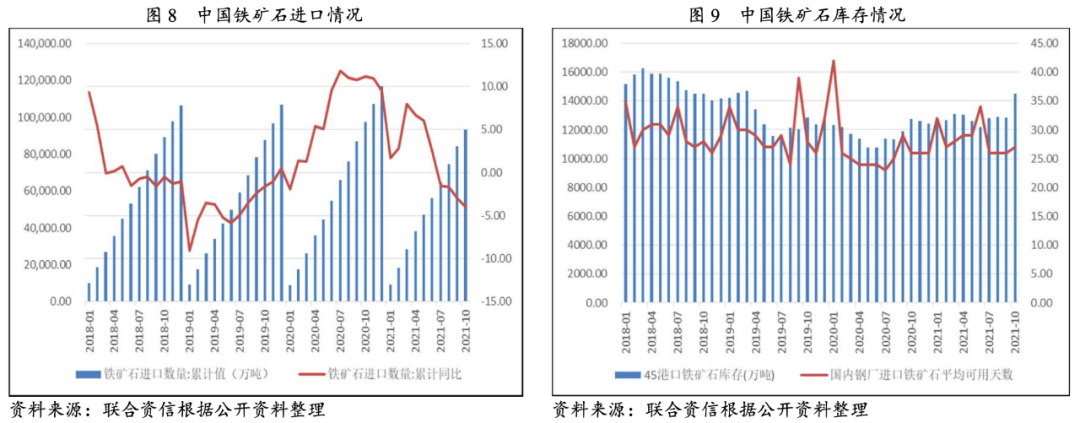 受制于鋼鐵產(chǎn)量的低增長(zhǎng),2021年1—10月中國(guó)鐵礦石進(jìn)口量同比負(fù)增長(zhǎng),鋼廠開(kāi)工率不足以及港口鐵礦石庫(kù)存偏高導(dǎo)致短期內(nèi)鐵礦石進(jìn)口及港口吞吐量面臨一定壓力,若未來(lái)鋼材需求及產(chǎn)量增速回升,港口鐵礦石吞吐壓力將有所緩解。