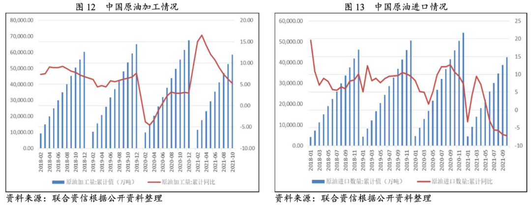 2021年1—10月,全國(guó)原油加工量5.85億噸,同比增長(zhǎng)5.20%,增速低于2019年水平,主要系疫情抑制了客運(yùn)周轉(zhuǎn)導(dǎo)致燃油消耗需求不足。中國(guó)對(duì)原油需求的缺口較大導(dǎo)致對(duì)進(jìn)口嚴(yán)重依賴,2021年1—10月,全國(guó)原油進(jìn)口量4.25億噸,同比下降7.2%,受需求不足以及國(guó)際原油價(jià)格較高影響已處于負(fù)增長(zhǎng)狀態(tài)。鑒于新冠疫情的持續(xù)反復(fù)及疫情防控的常態(tài)化,預(yù)計(jì)未來(lái)短期內(nèi)港口原油吞吐量仍將面臨較大壓力。